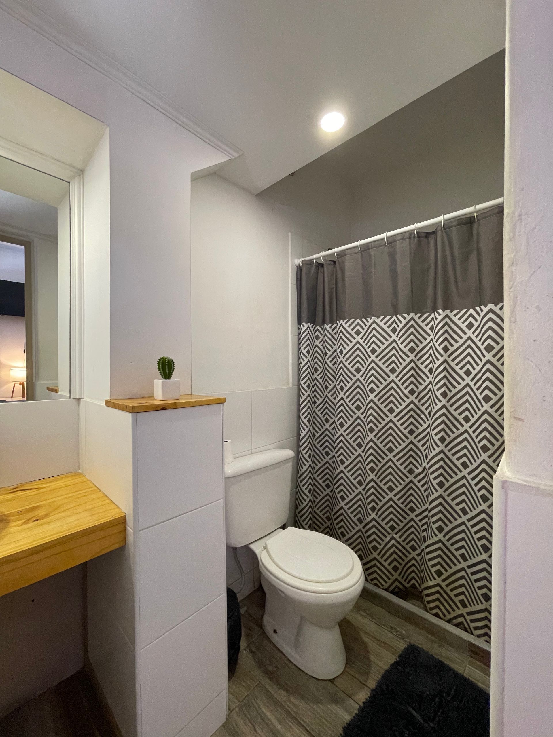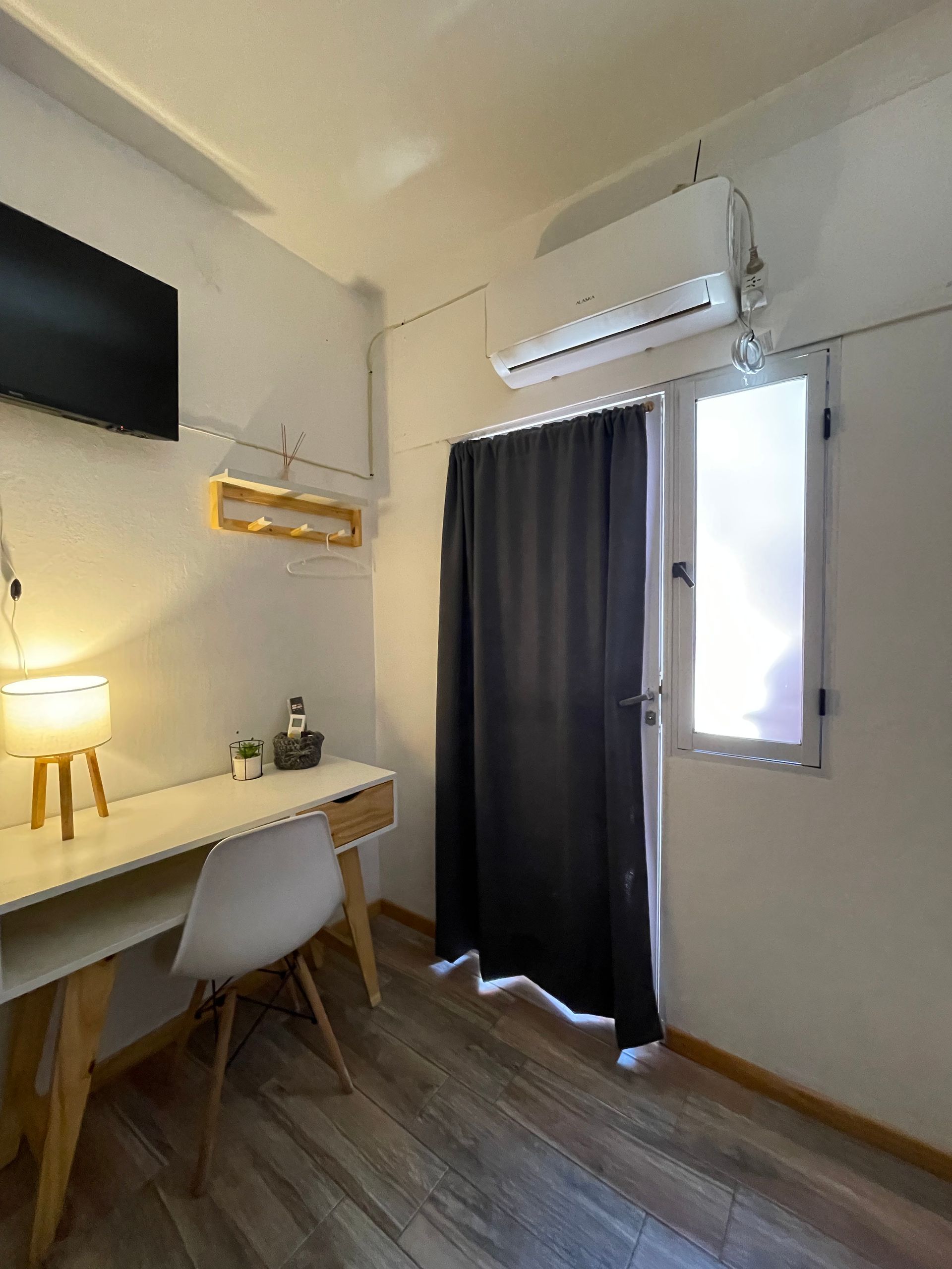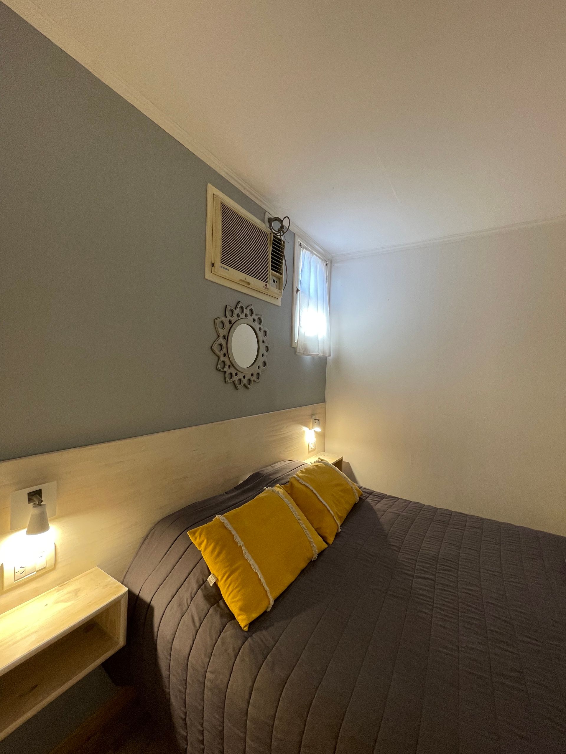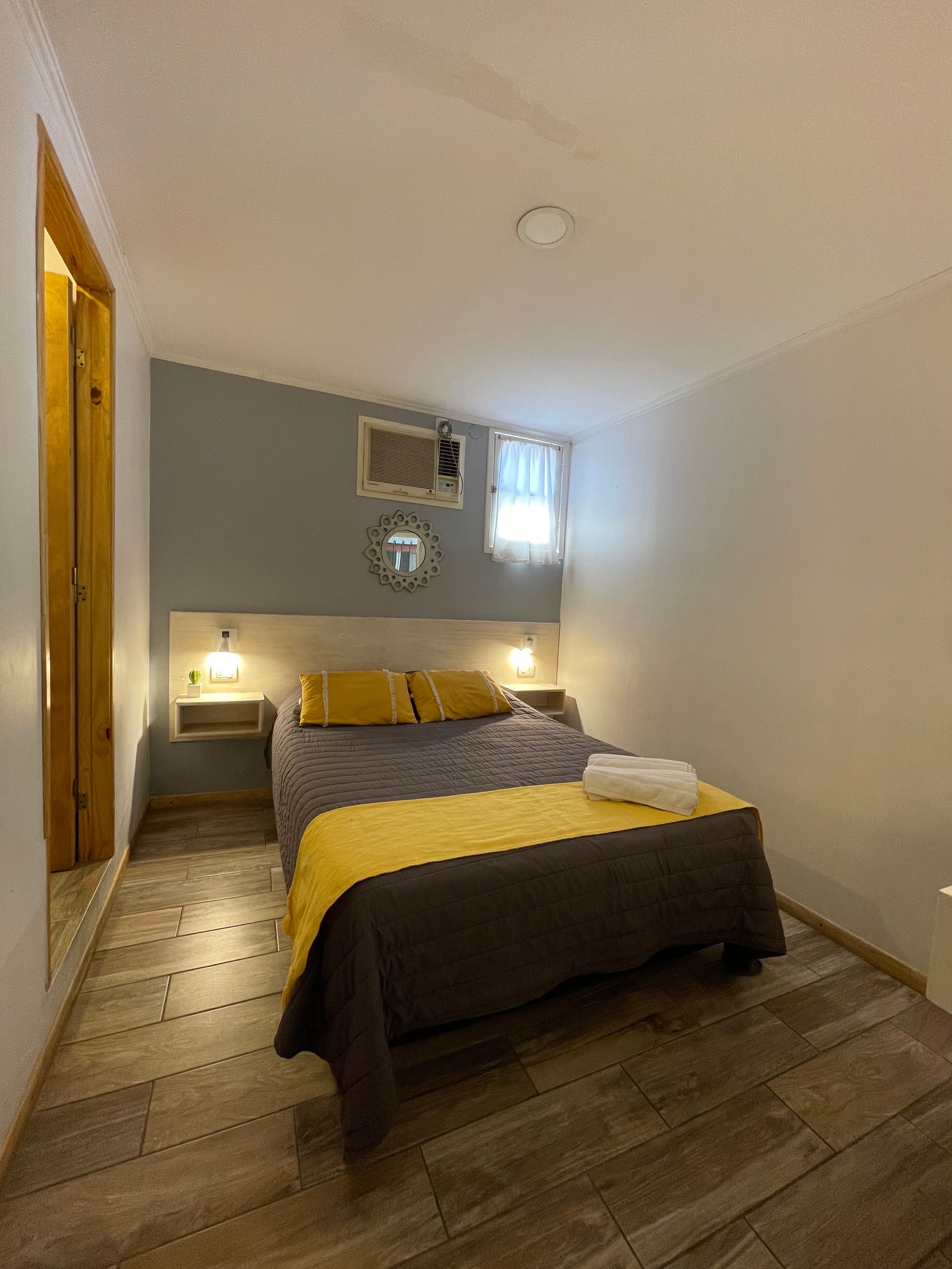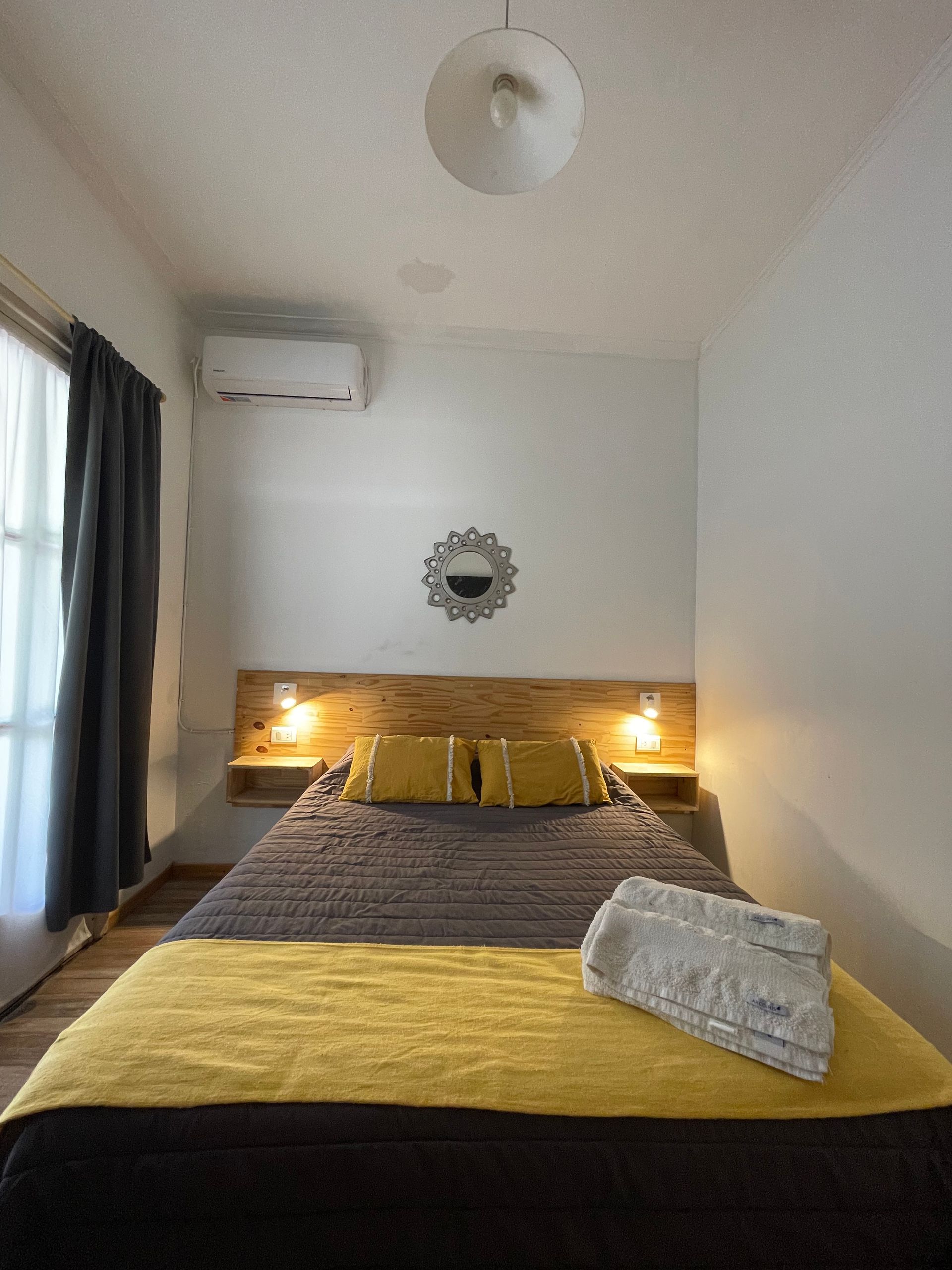 Habitación con cama matrimonial y baño compartido. Cuenta con aire acondicionado frío/calor, Smart TV, lockers, enchufes y luces de noche. Desayuno y blanquería incluidos.