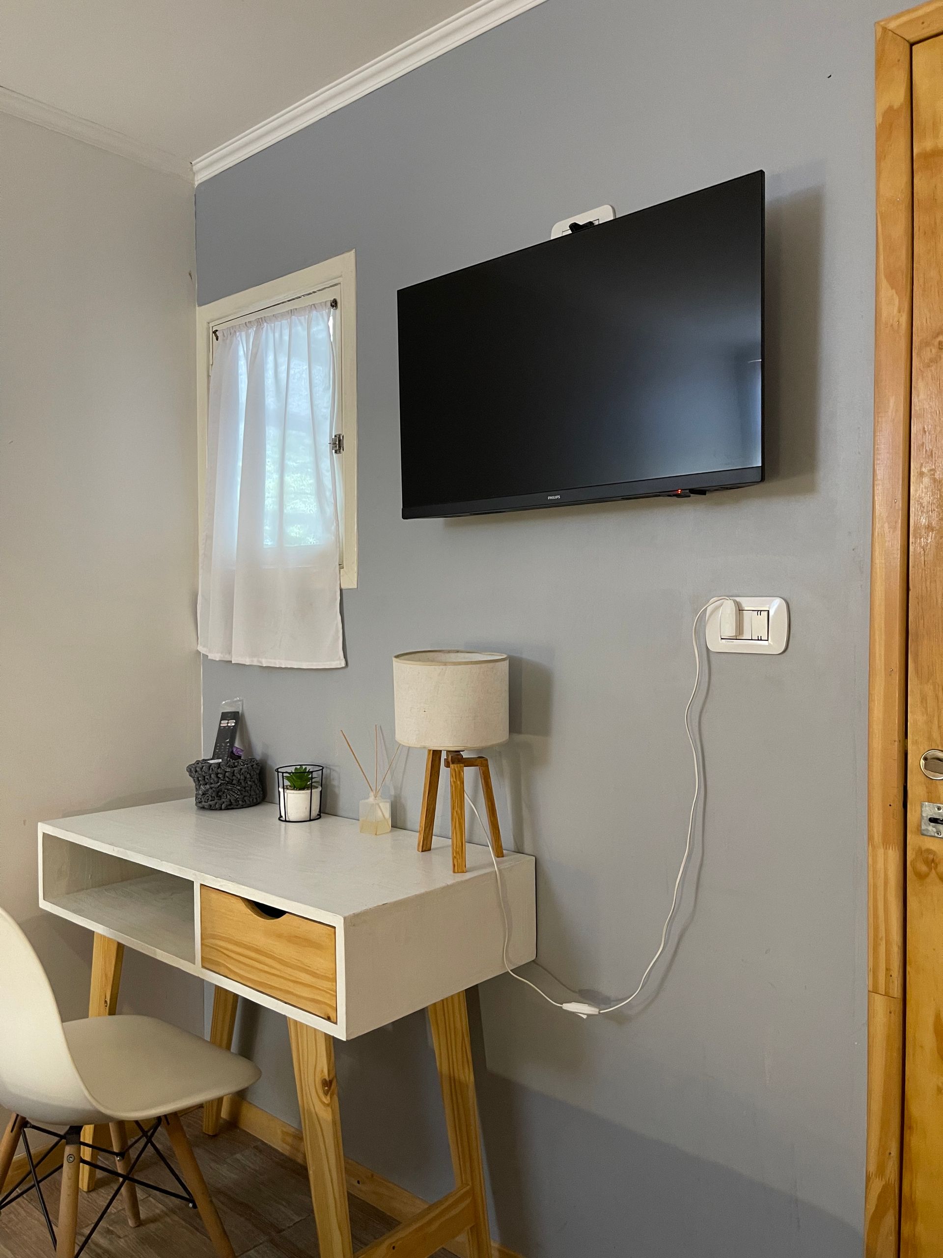 Habitación matrimonial con balcón, baño privado, escritorio, luz de noche, aire acondicionado frío/calor, WiFi y Smart TV. Desayuno y blanquería incluidas.